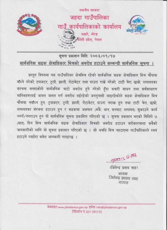 » सार्वजनिक सडक क्षेत्राधिकार भित्रको अवरोध हटाउने सम्बन्धी सार्वजनिक सचना