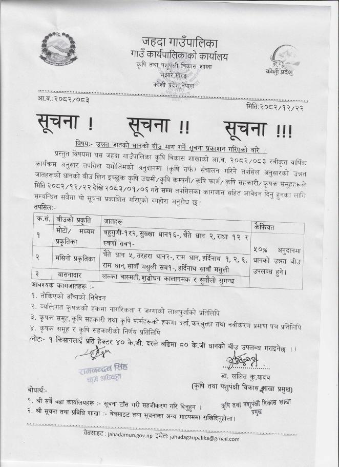 उन्नत जातको धानको बिउँ माग गर्ने बारे सुचना ।