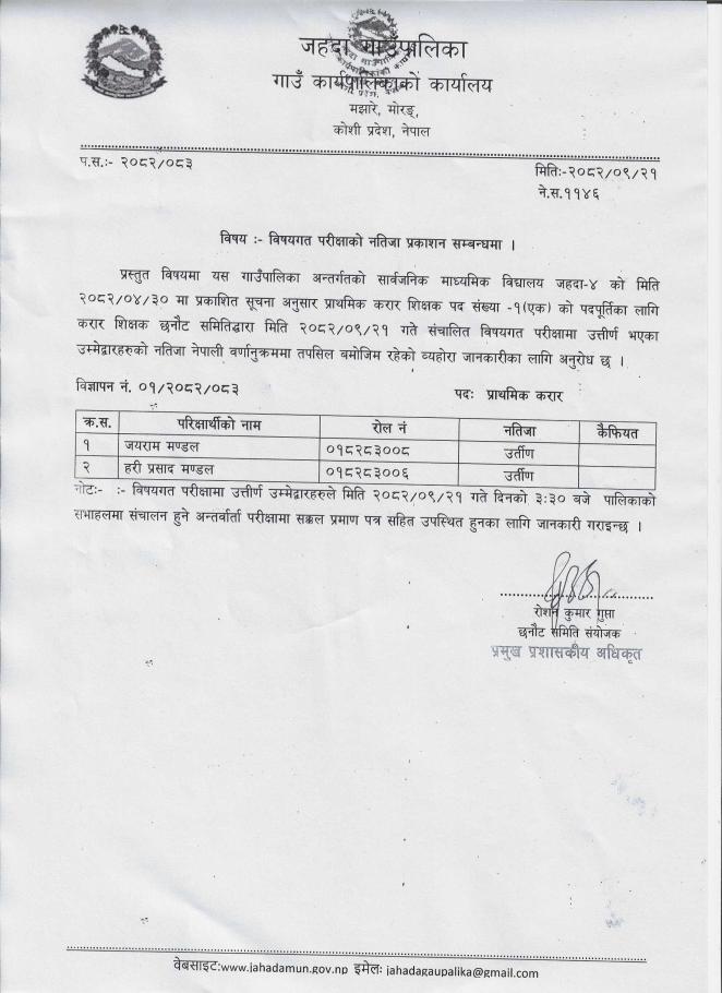 विषयगत परीक्षा नतिजा सम्बन्धमा ।